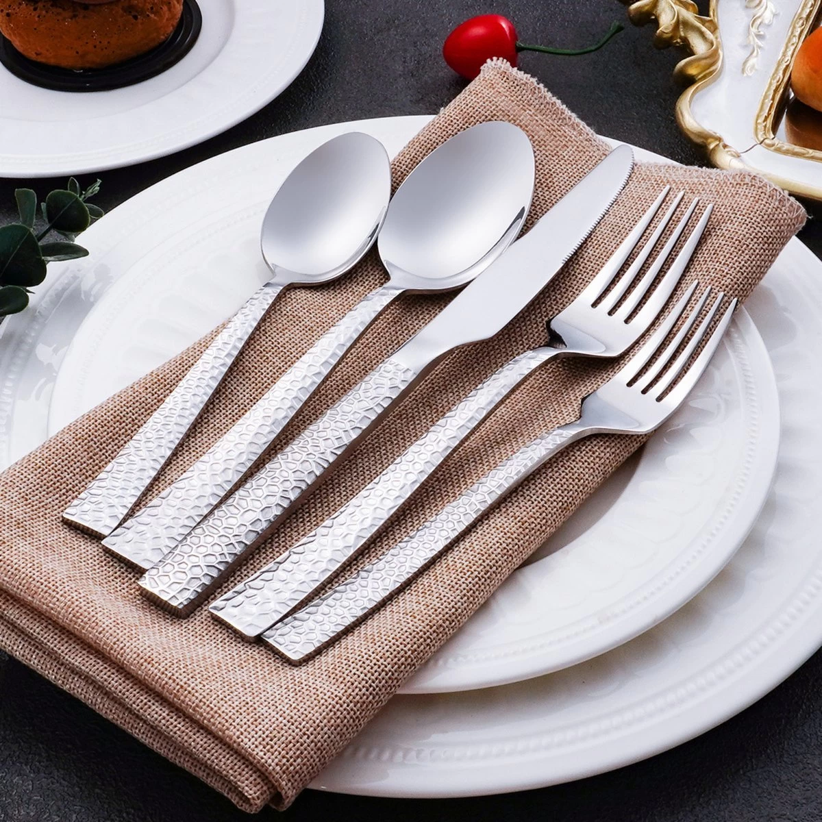 Deze bestekset heeft een prachtige esthetiek met fijne lijnen en een elegant gehamerd ontwerp dat je eettafel zal verheffen, zodat jij een statement maakt bij je gasten. Gemaakt van hoogwaardig 18/0 roestvrij staal dat jarenlang meegaat.