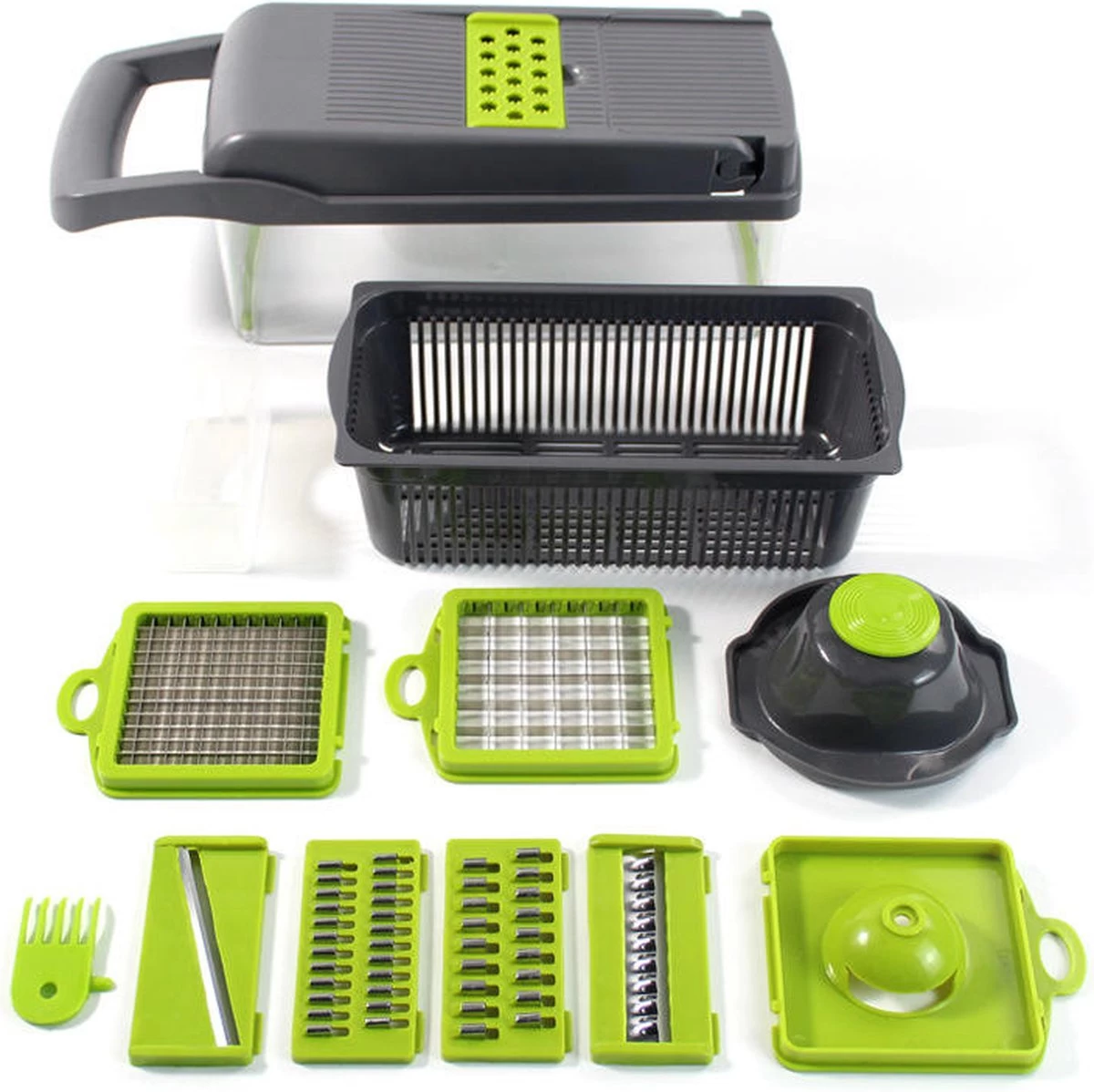 De ideale alles-in-1-vervanger voor al uw keukengerei. Deze multifunctionele mandoline kan gebruikt worden als handmatige groentesnijder, uiensnijder, frietsnijder, saladesnijder en/of fruitsnijder. Zeer efficiënt en gemakkelijk in gebruik. Door de scherpe, roestvrijstalen messen snijdt u moeiteloos uw groenten en fruit in kleine stukjes. Door de verschillende soorten opzetstukken kunt u kiezen voor kleine of grote blokjes. Bovendien komt alles wat u snijdt of raspt in een opvangbak terecht, zodat uw aanrecht netjes schoon blijft. De set is voorzien van een mandje waardoor u alle gesneden producten na afloop kunt afspoelen onder de kraan. Deze 15-delige set is gemakkelijk schoon te maken en weer op te bergen.