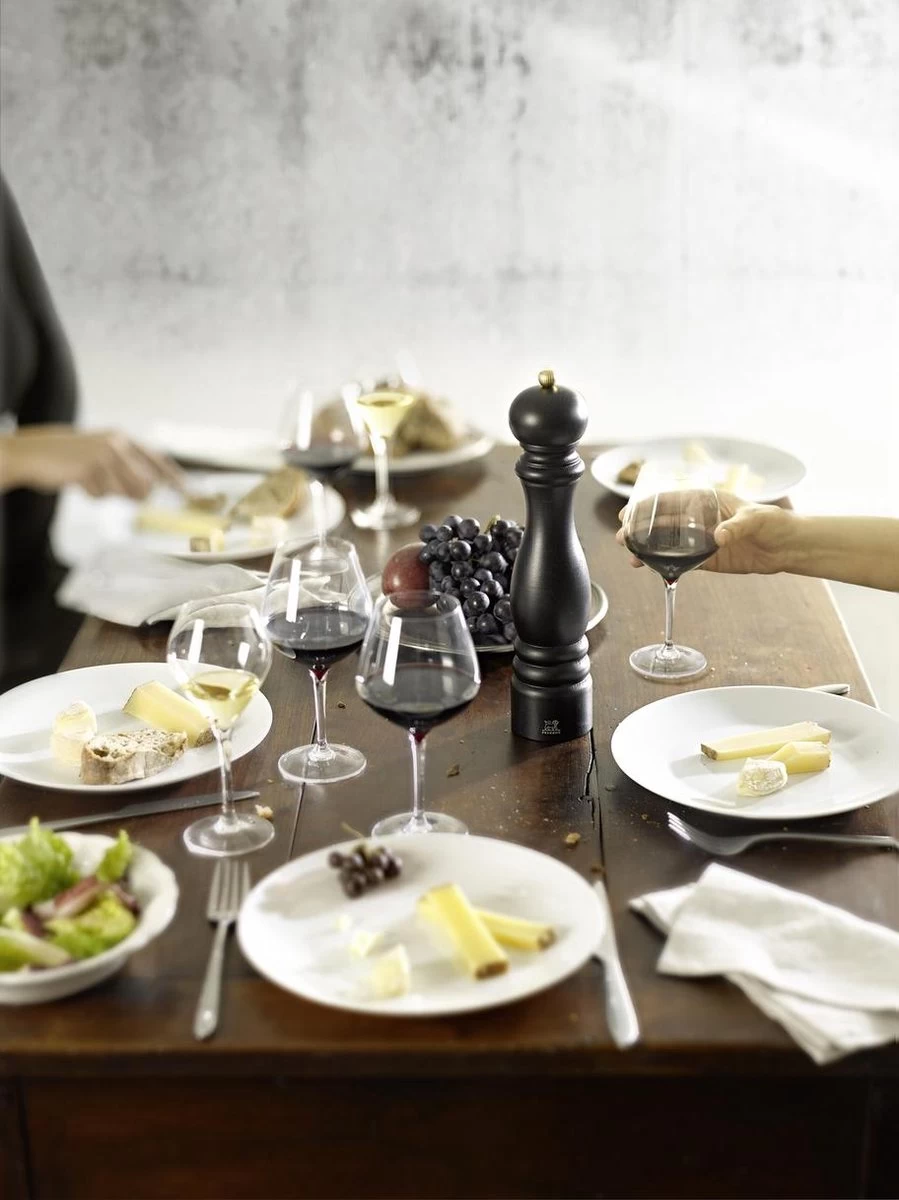 Het model ‘Paris’ is het klassieke, meest bekende model van Peugeot. De molen is gemaakt uit gelakt beukenhout in de kleur chocolade.De molen is voorzien van het unieke u-select systeem, waarmee de grofheid van de maling traploos en nauwkeurig wordt ingesteld door de ring aan de voet van de molen te draaien.Peugeot heeft voor iedere specerij een eigen maalwerk, dat het beste uit de specerij haalt. Het unieke Peugeot maalwerk is gemaakt uit gehard en gesmeed staal. Op het functioneren van het maalwerk geldt maar liefst levenslange garantie.30 cm. Inclusief peperkorrels