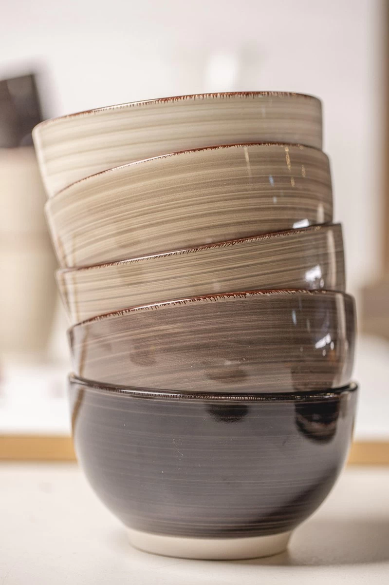Studio Tavola Kom Vintage Loft Ø 14 cm – 6 StuksGeef je tafel een stoere, vintage look met deze kommen! Wil je graag een keer iets anders dan je standaard witte servies, maar wil je niet teveel uitpakken? Deze kommen zijn dan ideaal voor jou. De prachtige neutrale kleuren zijn anders, maar vallen zeker niet teveel op. Let wel op: deze kommen worden gemixt geleverd, er kan dus geen kleur gekozen worden. Combineer de kommen met bijvoorbeeld de ontbijtborden, bekers of dinerborden, of kies juist voor heel ander servies.
